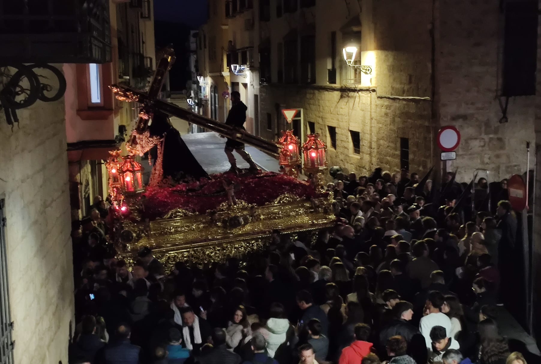 La Antigua, Insigne y Real Cofradía de Nuestro Padre Jesús Nazareno y María Santísima de los Dolores, se encuentra en las calles de Jaén. Momento muy especial el del encuentro entre Jesús y la Señora de los Dolores en la Plaza de Santa María, con la mirada firme de la maravillosa Catedral que firmara Andrés de Vandelvira. Salía del Camarín de Jesús a las 2:30 de la madrugada entre mil y un aplausos que venían de todos los rincones aledaños al templo, desde la Carrera de Jesús y, por supuesto, de los cantones que están asociados de forma indisoluble a Nuestro Padre Jesús ‘El Abuelo’.