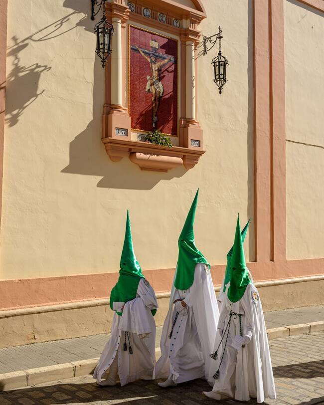 Se abren las puertas del cancel y, en medio del silencio expectante, aparece la cruz de guía. Da comienzo así un cortejo solemne formado por nazarenos vestidos con túnica y capa blanca, y antifaz verde. Avanzan en varios tramos, separados por las distintas insignias que, desde siempre, han sido una seña de identidad de esta Hermandad, no solo por su cantidad, sino también por la diversidad y riqueza que representan.