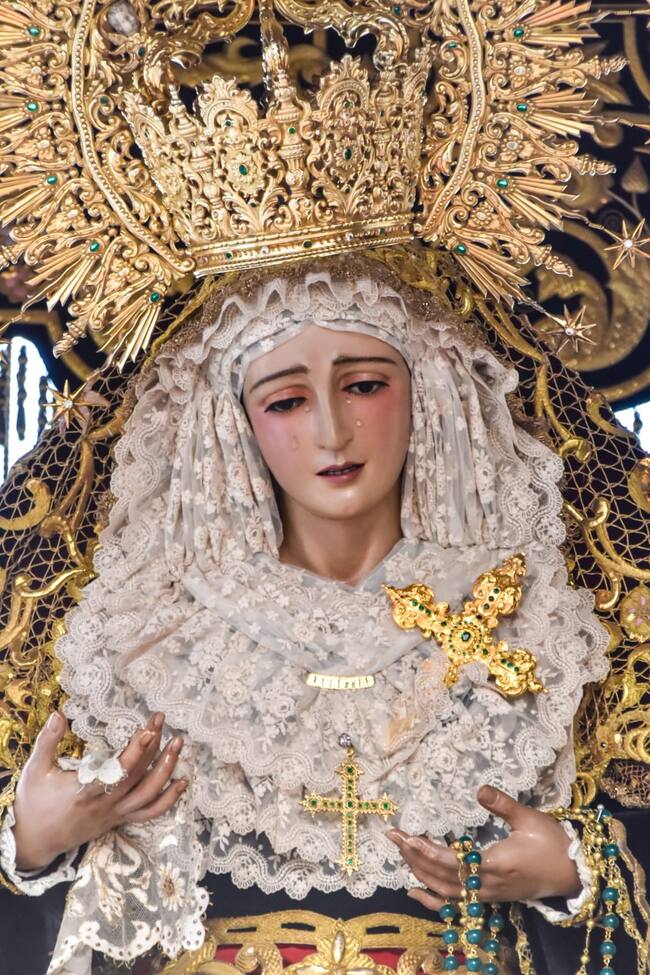 Su rostro, de delicada serenidad, es reflejo del dolor asumido con amor. Sus lágrimas que recorren sus mejillas y su mirada lo dicen todo: la pérdida, la entrega, la fe inquebrantable de una madre que ha visto morir a su Hijo. Sus ojos no buscan consuelo, lo ofrecen. Son remanso en medio del duelo, faro para los corazones que se pierden en su contemplación.