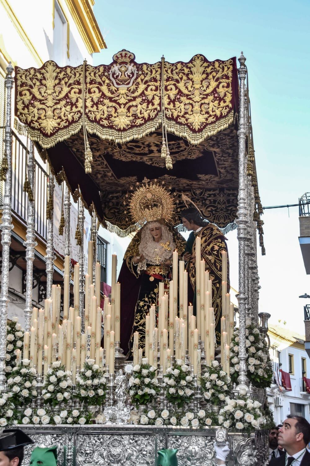 Bajo su palio bordado con primor y recogimiento, la Virgen camina como flotando, vestida con la elegancia austera de quien ha aprendido a sufrir con dignidad., con el puñal, clavado en su pecho, como símbolo del dolor, del amor más puro y del sacrificio más profundo.