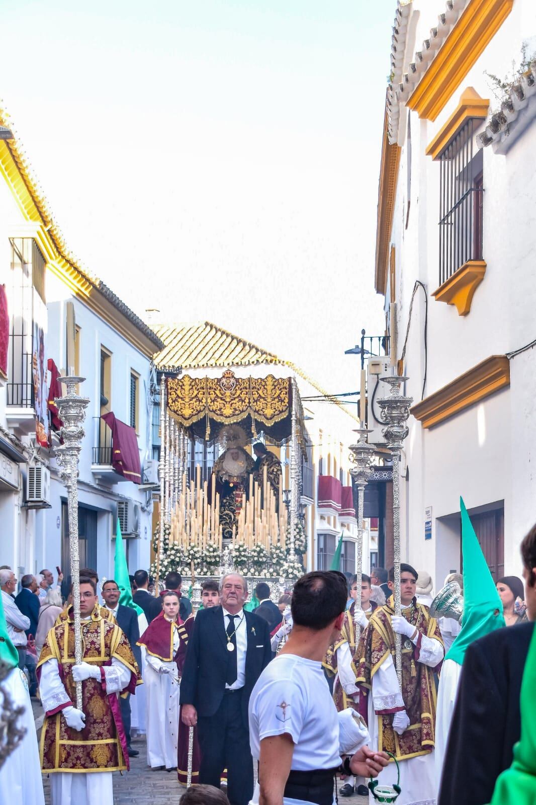 Se abren las puertas del cancel y, en medio del silencio expectante, aparece la cruz de guía. Da comienzo así un cortejo solemne formado por nazarenos vestidos con túnica y capa blanca, y antifaz verde. Avanzan en varios tramos, separados por las distintas insignias que, desde siempre, han sido una seña de identidad de esta Hermandad, no solo por su cantidad, sino también por la diversidad y riqueza que representan.