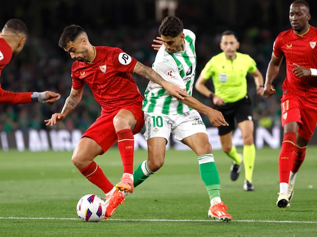 SEVILLA, 28/04/2024.- El centrocampista del Betis Ayoze Pérez (2-d) pelea un balón con Jesús Fernández 'Suso' (2-i), del Sevilla, durante el partido de Liga en Primera División que Real Betis y Sevilla FC disputan este domingo en el estadio Benito Villamarín. EFE/Julio Muñoz / Julio Muñoz (EFE)