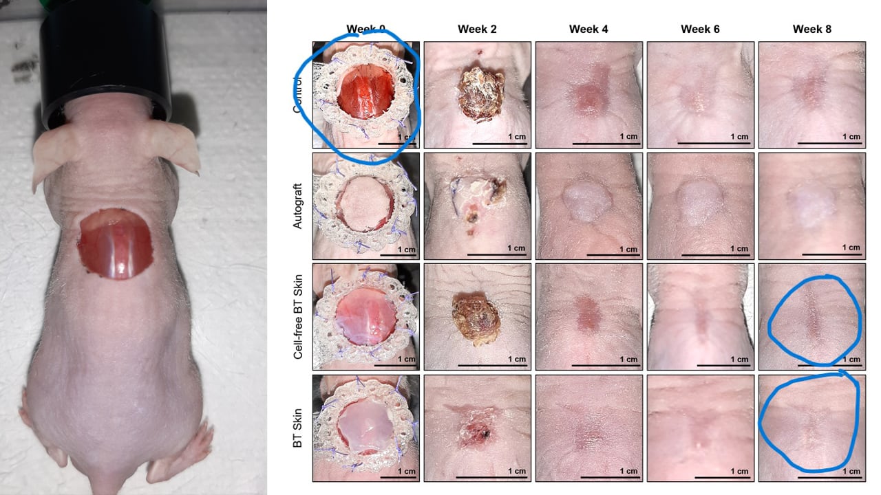 El BT Skin ha demostrado en estudios preclínicos realizados en modelos de heridas en ratones su capacidad para acelerar la cicatrización, favoreciendo la reepitelización y reduciendo la inflamación en comparación con heridas no tratadas. En tan solo 14 días, el nuevo sustituto cutáneo permitió un cierre temprano de las heridas, obteniendo resultados comparables a los de los autoinjertos de piel.