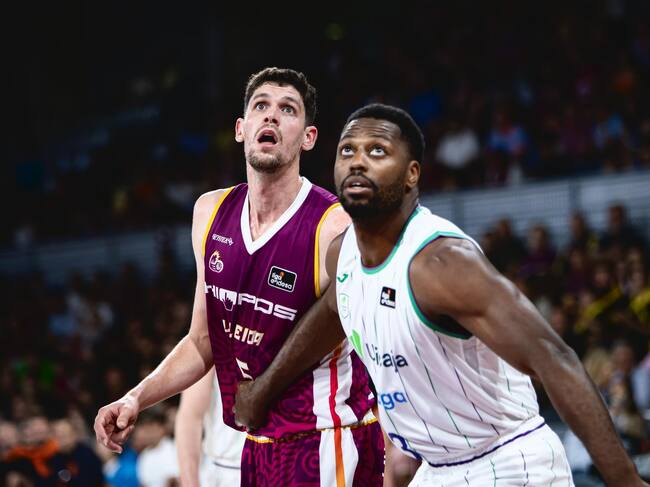 Ejim lucha por el rebote con Paulí en una acción del Hiopos Lleida - Unicaja / Hiopos Lleida