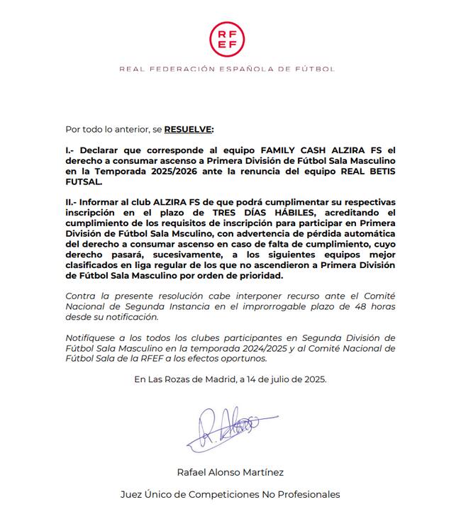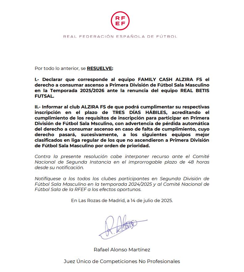 La Federación Española de Fútbol ha decidido que el Alzira ascienda a la Primera División de fútbol sala en sustitución del Betis, que renunció a su plaza por diversos motivos, en detrimento del Málaga Ciudad Redonda, que solicitó ese lugar al disputar la última eliminatoria del play off de ascenso.