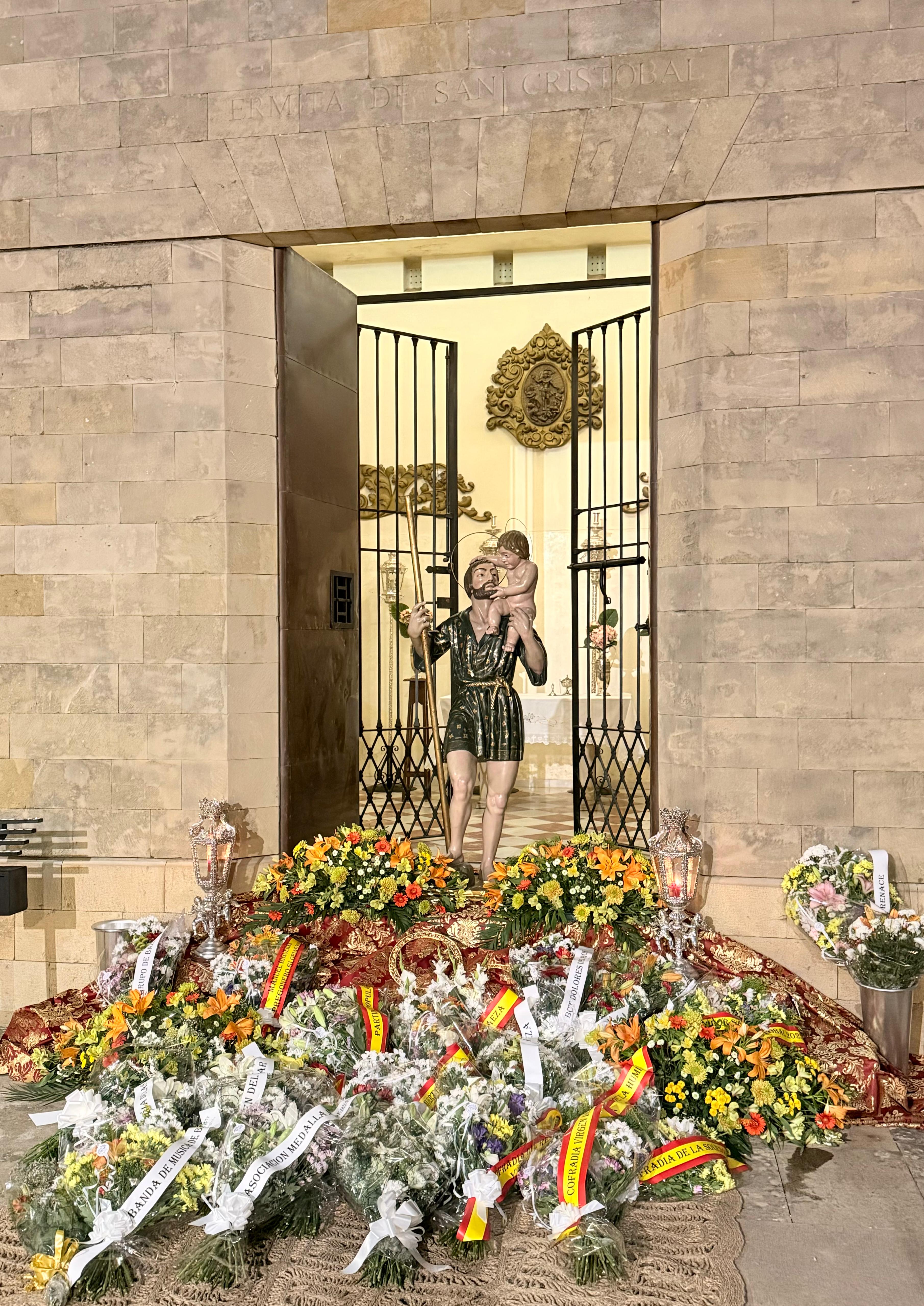 Gran ofrenda floral a San Cristóbal, en Baeza, con motivo de su 50 aniversario. Ayer domingo fue un día muy especial en el Arca del Agua de la ciudad Patrimonio de la Humanidad ya que, en su capilla, esta devoción del tiempo de glorias recibió el cariño y el respeto de sus vecinos y vecinas más insignes. Y es que, recordamos, hace bien poco se daba el pistoletazo de salida a los actos y cultos del medio siglo de historia de esta talla de Manuel Rodríguez Delgado.