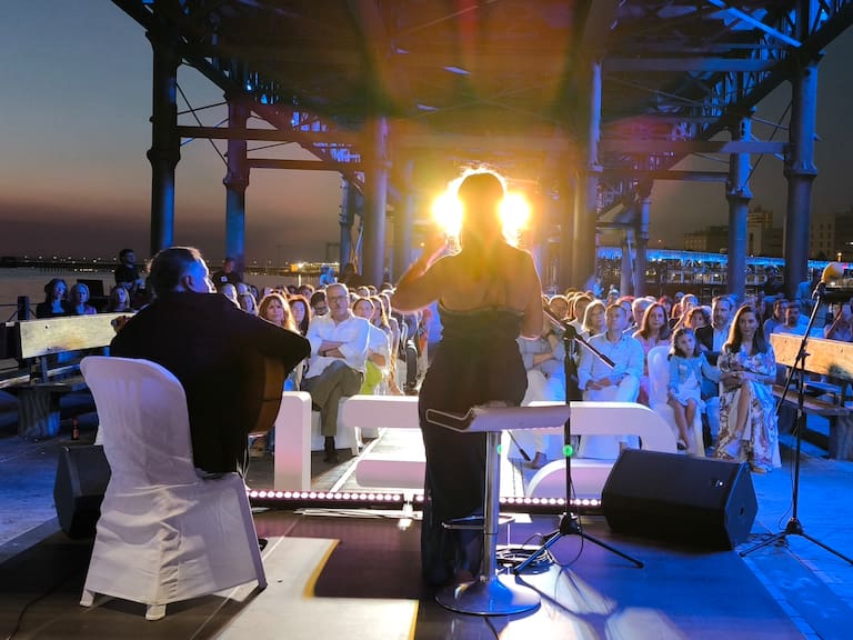 En anteriores ediciones hemos contado con estilos tan diferentes como el jazz, la música clásica o el bolero, siendo, en esta ocasión, el flamenco de estos dos grandes intérpretes, el nexo entre Huelva y América. Esta velada musical “Entre dos orillas”, comenzó en 2018 con el Grupo Almadraband, dirigido por la profesora del conservatorio de Huelva Marideli Rodríguez. En 2019 intervinieron músicos llegados del Festival Internacional de Música Clásica de Isla Cristina; en 2020 Virginia Ruíz Trío (Jazz improvisación); ya en 2021 la Pianista Carmen Noja y al año siguiente, 2022, la Cantante Rocío de Abril. Fue brillante en 2023 la interpretación de la “concertino” en numerosas orquestas, la violinista Nelly Romero con José Rodrigo a los teclados, ambos músicos del conservatorio superior de Sevilla y el pasado año se entabló un hermoso diálogo entre grandes poetisas de ambos lados del atlántico con el propio océano a través del espectáculo: “Mujeres y el Mar” de la Compañía Tusitalas Producciones. Finalmente, este 2025, el protagonista fue nuestro bien inmaterial de la humanidad, el flamenco, en la voz de Regina con la Guitarra de Joaquín Brito