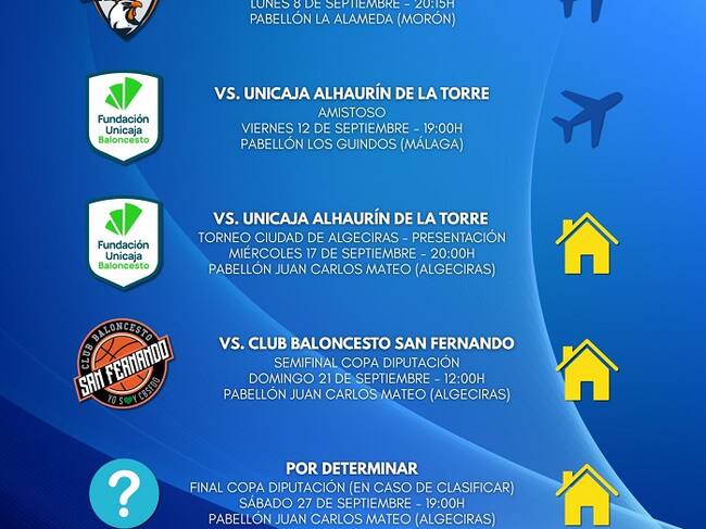 La recta final de la pretemporada se disputará el domingo 21 de septiembre con la semifinal de la Copa Diputación frente a CB San Fernando desde las doce en casa y la posterior final de este torneo que se jugará, en caso de clasificar, el sábado 27 a las 19.00 horas también en Algeciras.
