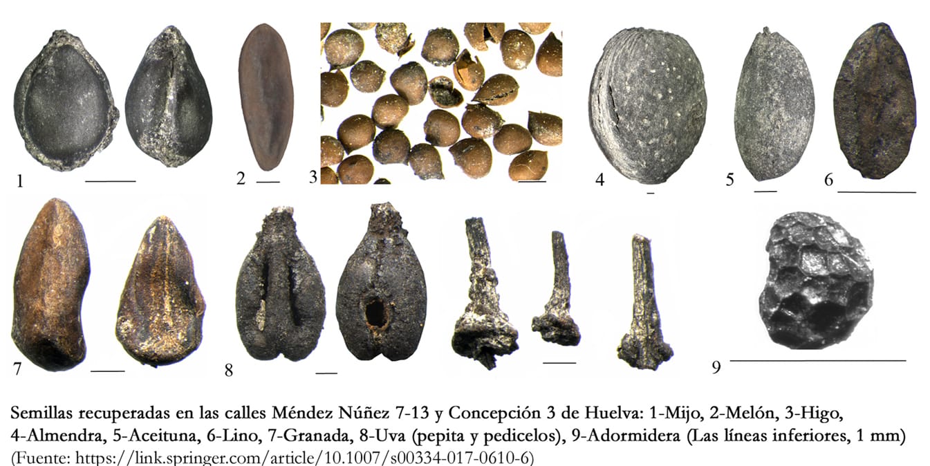 Las semillas, datadas por carbono 14 en el siglo IX a.C., confirman que en Huelva se cultivaban uvas, higos, almendras, aceitunas, granadas y melón amargo