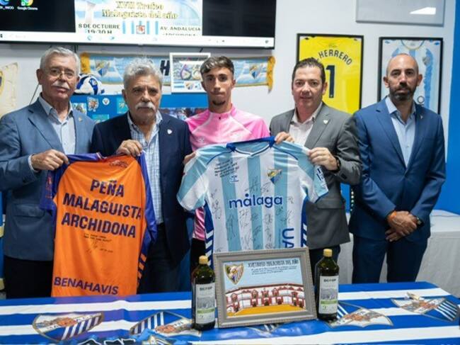 El jugador del Málaga David Larrubia ha recibido su peso en aceite (64,1 kilos) en la Peña Malaguista de Archidona en su decimoséptimo aniversario, tras ser elegido en asamblea como mejor jugador del conjunto malagueño en la temporada 2024-25.