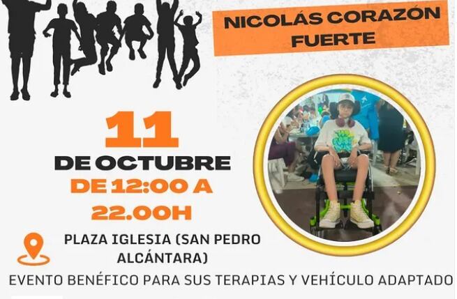 Por ello, se ha organizado un evento benéfico bajo el eslogan de `Nicolás Corazón Fuerte´ que se celebrará el sábado entre las 12 del mediodía y las 10 de la noche en la plaza de la Iglesia de San Pedro Alcántara, donde habrá distintas actuaciones musicales, castillos hinchables, tatuajes infantiles, barra de bebida y comida.