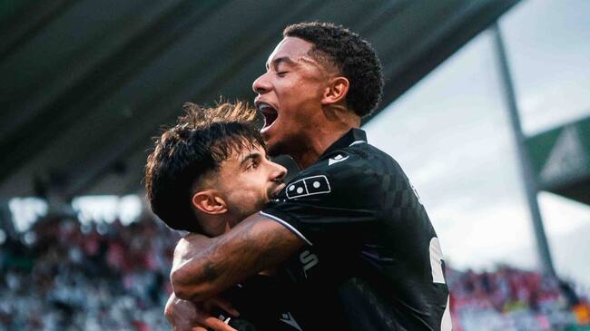 Arnau y Chirino celebrando el gol que adelantaba el Almería en 'El Arcángel' antes de la media hora. / UD Almería