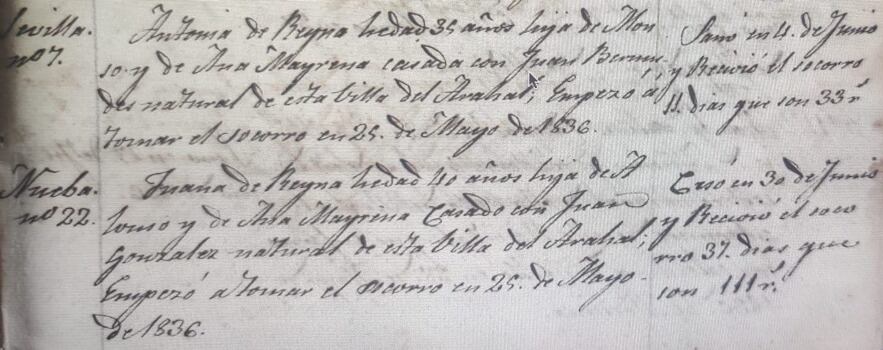 Seguna anotación. “ Nueba nº 22. Juana de Reyna hedad 40 años hija de Alonso y de Ana Mayrena casado con Juan Gonzalez natural de esta billa del Arahal. Empezó a tomar el socorro en 25 de Mayo de 1836. Ceso en 30 de Junio y recivio el socorro 37 dias que son 111 reales. “