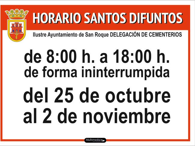 Todos los cementerios de San Roque permanecerán abiertos de forma ininterrumpida de 8:00 a 18:00 horas del 25 de octubre al 2 de noviembre. La Delegación de Obras y Servicios ha adoptado esta medida para facilitar las visitas a los camposantos con motivo de las festividades de Todos los Santos y de los Fieles Difuntos.