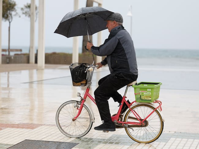GRAFAND6633. RINCÓN DE LA VICTORIA (MÁLAGA), 28/02/2025.- Un hombre pasea en bicicleta resguardándose de la lluvia con un paraguas en el Rincón de la Victoria (Málaga), este viernes con alertas de lluvia y tormentas en Andalucía. EFE/Jorge Zapata / Jorge Zapata (EFE)