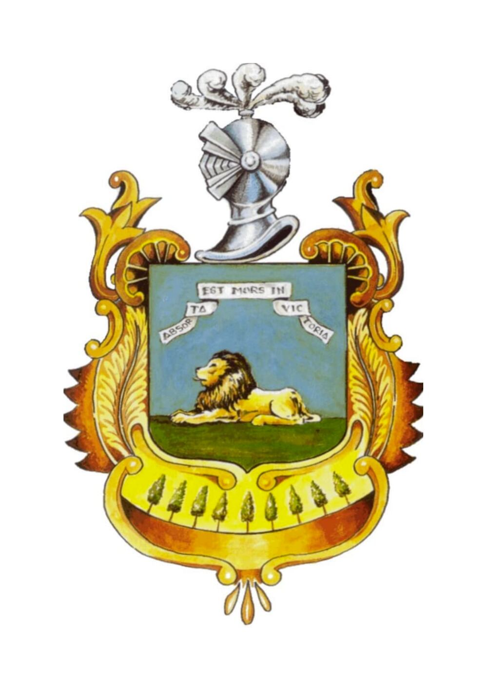 En el interior del mismo, en su parte central un blasón o mote blanco con la inscripción latina de un texto de San Pablo : “ Absorta est mors in victoria” La muerte ha sido vencida por la victoria. Es una expresión del triunfo sobre la muerte, de raíz cristiana, que se interpreta como símbolo de esperanza, resurrección y victoria espiritual. Por tanto, su inclusión en el escudo da un sentido más religioso y trascendente.