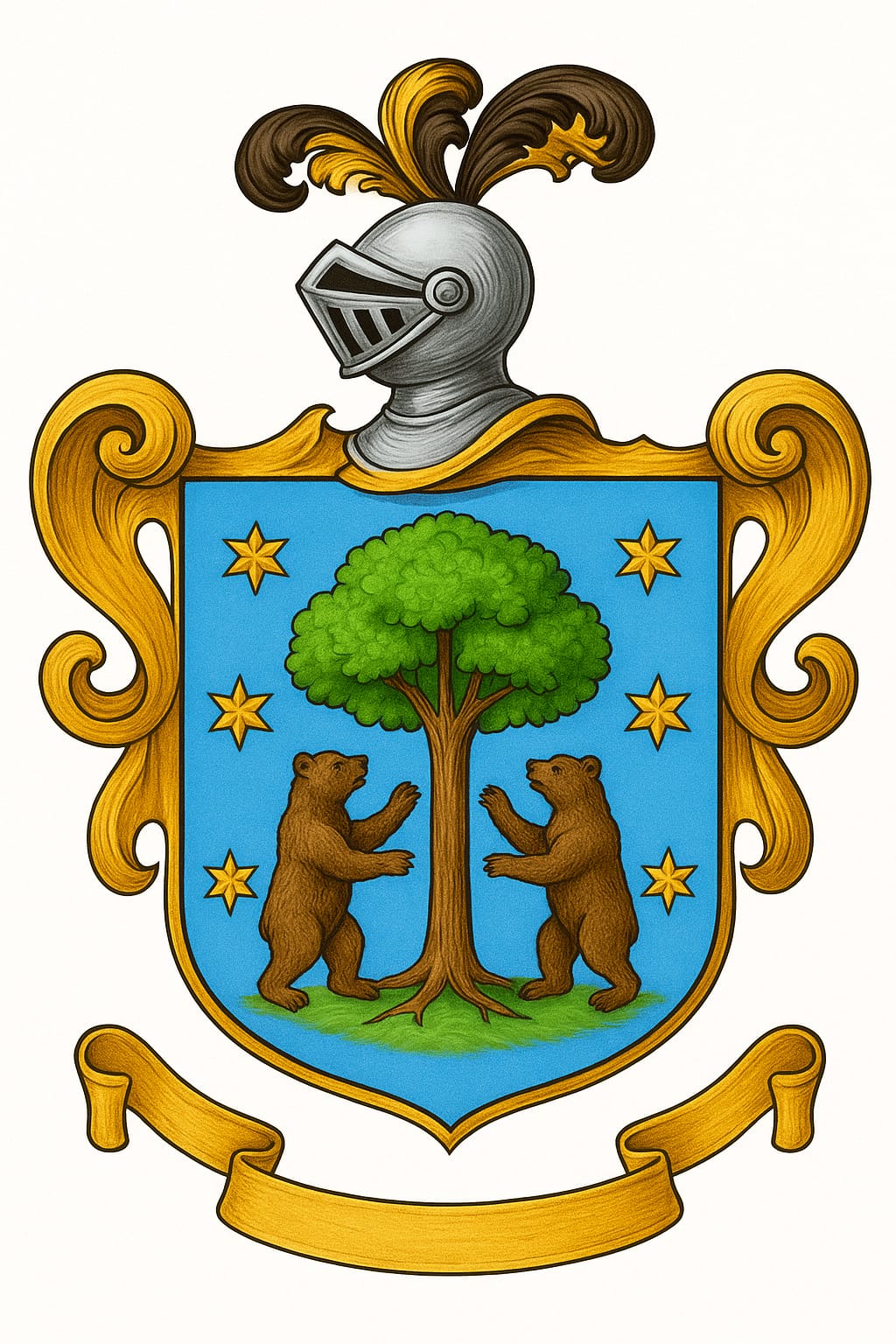Representa un árbol verde en campo celeste y en él repartidas seis estrellas de plata y arrimados al tronco de dos osos en ademán de querer subir a la copa, siendo este árbol un pino u otra especie semejante. En la parte superior un yelmo de caballero con penacho de plumas.