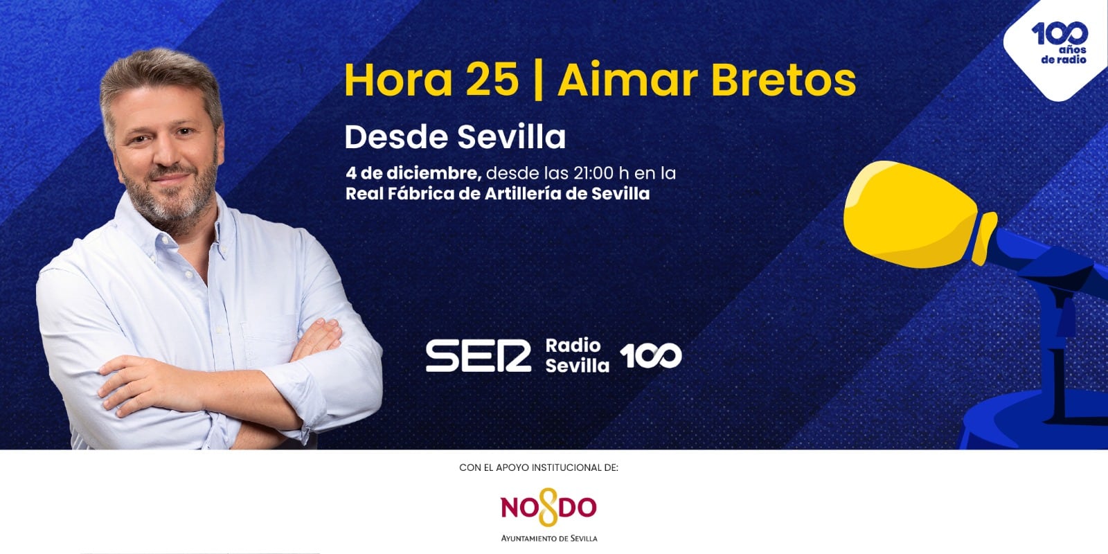 Este próximo 4 de diciembre, Hora 25 de la Cadena SER se realizará desde Sevilla, en una edición especial desde la Real Fábrica de Artillería. Aimar Bretos y su equipo pondrán en antena este programa con público, que podrá acceder con invitación, hasta completar aforo.