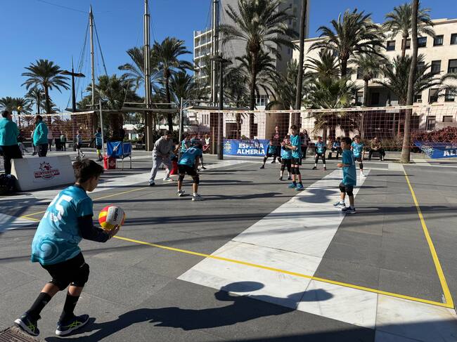 El Ayuntamiento de Almería lo tiene claro. Quiere una ciudad activa, y hoy se ha vuelto a demostrar, entre otras iniciativas, con el entrenamiento al aire libre de los niños y niñas de los equipos alevín y benjamín del club Mintonette de voleibol, que han trasladado sus sesiones en el Palacio de los Juegos Mediterráneos al centro de la ciudad, para fomentar este deporte y, a la vez, promocionar el gran evento con el que se cerrará el año, el Campeonato de España de Voleibol Cadete, que reunirá en Almería y provincia, del 27 al 30 de diciembre, a 230 equipos y más de 3.500 jugadores, lo que supondrá un mínimo de 30.000 pernoctaciones, y generará importantes beneficios para la hostelería y el comercio de la ciudad.