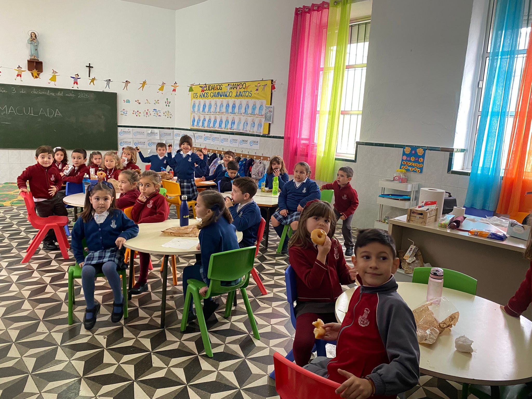 La jornada incluyó también los ensayos y posteriores actuaciones musicales de cada clase, donde se interpretan canciones dedicadas a la Virgen de la Inmaculada. Hernández recordó que este tipo de actividades se enmarca en un trimestre especialmente intenso: “Podemos hablar de una cierta resaca emocional después del culmen del 125º aniversario”.