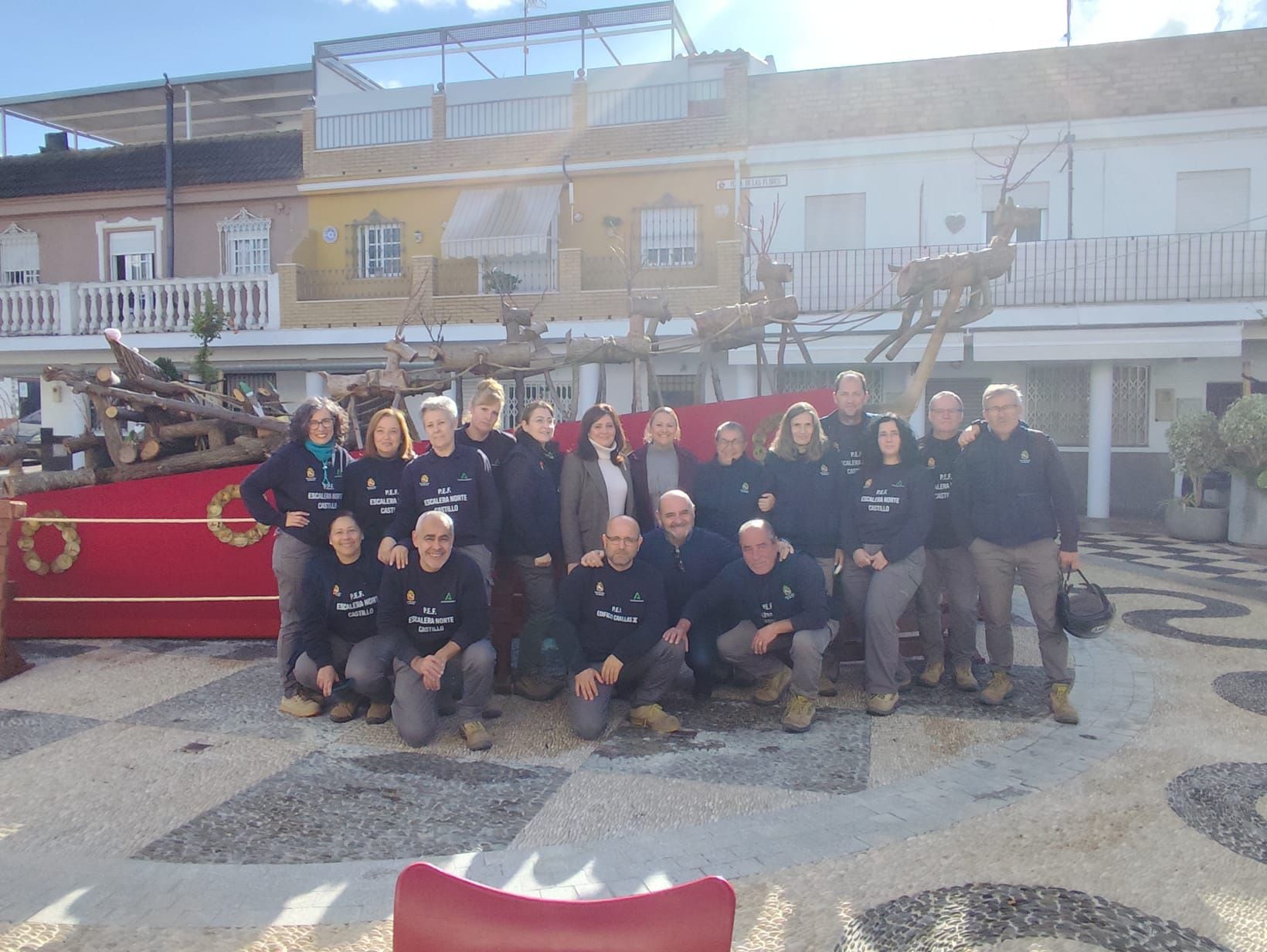 En esta edición, los 15 alumnos del Proyecto Escalera Norte del Castillo, junto a su equipo docente y directivo, han compaginado la construcción de una escalera de madera para los accesos al Castillo con el montaje del trineo navideño en la plaza. La instalación incluye figuras de Papá Noel, renos y un cargamento de regalos, simbolizando la recuperación del arbolado caído y su reconversión en elementos decorativos.