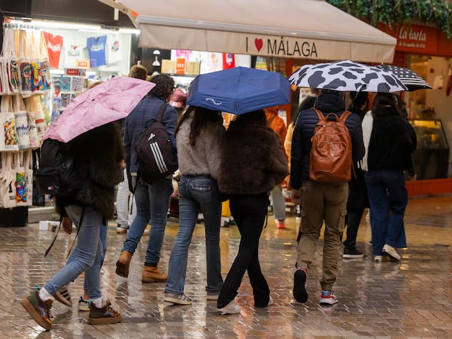 Un grupo de personas con sus paraguas en el centro de Málaga este sábado, que se encuentra desde las 15.00 hasta las 4:00 de la madrugada en alerta roja por lluvias. EFE / Carlos Díaz. / Carlos Diaz (EFE)