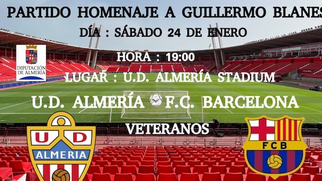 El Almería y el FC Barcelona, de veteranos, jugarán el próximo sábado, día 24 de enero, un partido muy especiao y emotivo en el Estadio de los Juegos Mediterráneos que servirá para rendir un más que merecido homenaje a Guillermo Blanes, el fundador de la UD Almería, y tendrá carácter benéfico. Las entradas, al precio de 10 euros, se pueden adquirir ya en las tiendas Blanes y además el próximo sábado, día 3 de enero, también se podrán adquirir en los exteriores del recinto deportivo de la Vega de Acá, en la previa del encuentro del curso 25-26 en el Campeonato Nacional de Liga en Segunda División que enfrentará al Almería y al Granada, choque correspondiente a la 20ª jornada en la categoría de plata del fútbol nacional y que servirá para abrir el 2026, un año que se presenta muy especial para el Almería que preside Mohammed Al-Khereiji con el objetivo del ascenso a la máxima categoría del fútbol español, así como también los retos de la Ciudad Deportiva en El Toyo y ejecutar las obras de la Fase 2 del Estadio de los Juegos Mediterráneos.