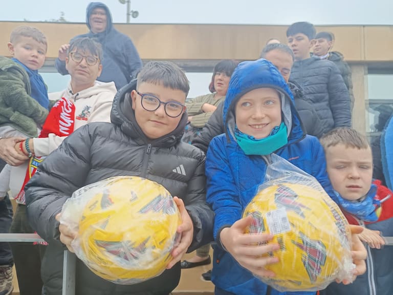 El primer entrenamiento de la semana en el campo Anexo del Estadio de los Juegos Mediterráneos acabó con los futbolistas del Almería repartiendo balones a los pequeños que vieron en directo la sesión de trabajo.