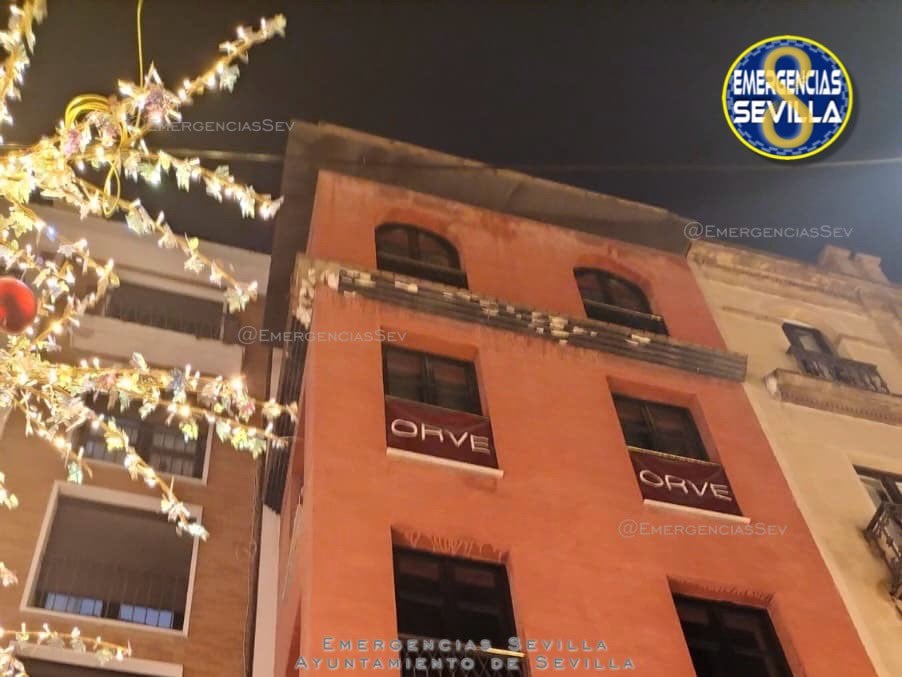 Los bomberos del Servicio de Emergencias de Sevilla han intervenido en la tarde de este domingo por el desprendimiento de una cornisa en la Avenida de la Constitución.