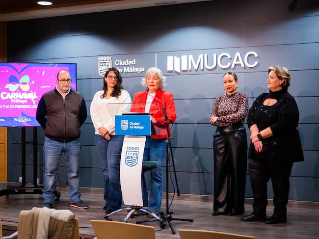 El Carnaval 2026 ha sido presentado por la concejala de Fiestas, Teresa Porras, el tesorero de la Fundación, Juan Luis Monío, las delegadas Miriam Ruiz y Montse Segado y la secretaria Virginia Pérez / Ayuntamiento de Málaga