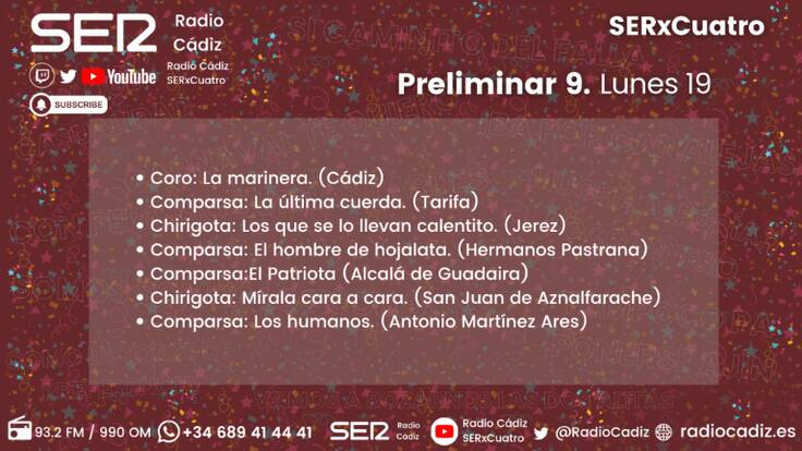 La sesión previa a la noche de cuchillos largos deja sobre la mesa en la 9ª preliminar uno de los regresos más esperados. Antonio Martínez Ares vuelve tras un año de ausencia y nos presenta 'Los Humanos'. Con un grupo con nuevas incorporaciones como la de Sehito, del grupo de Miguel Ángel García Argüez Chapa y Raúl Cabrera. Como cabeza de serie encontraremos a la comparsa de los hermanos Pastrana, con 'El hombre de hojalata'.