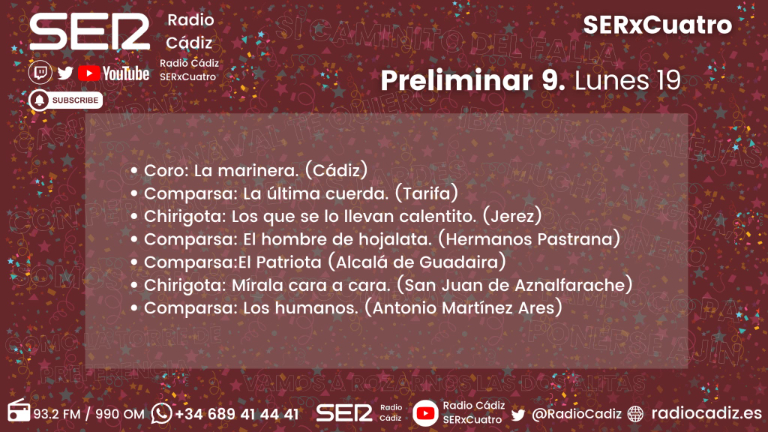 La sesión previa a la noche de cuchillos largos deja sobre la mesa en la 9ª preliminar uno de los regresos más esperados. Antonio Martínez Ares vuelve tras un año de ausencia y nos presenta 'Los Humanos'. Con un grupo con nuevas incorporaciones como la de Sehito, del grupo de Miguel Ángel García Argüez Chapa y Raúl Cabrera. Como cabeza de serie encontraremos a la comparsa de los hermanos Pastrana, con 'El hombre de hojalata'.