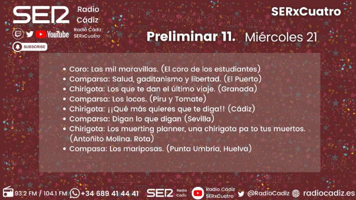 La undécima preliminar es una de las más esperadas de esta primera fase. En ella, tres agrupaciones en tres modalidades diferentes que buscarán dejar buenas sensaciones y pelear, como mínimo, por cantar dos días más. En el coro encontramos al de Bayón, conocido como el de Los Estudiantes, y quienes se llevaron al bolsillo el primer premio con 'El Gallinero' el pasado COAC 2025.