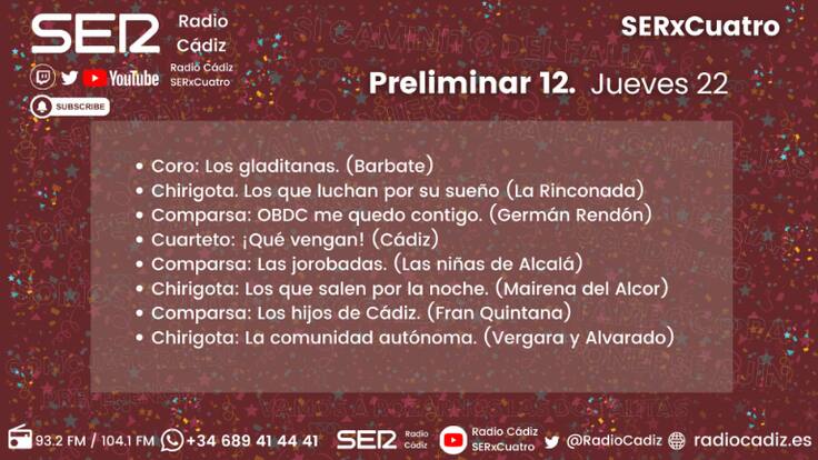 Comienza la recta final de las preliminares y la duodécima pone en la palestra a la comparsa de Germán Rendón con 'DesOBDC' y a la de Fran Quintana, quien buscará quitarse el mal sabor de boca del pasado COAC 2025 dejando este año 'Los hijos de Cádiz'.