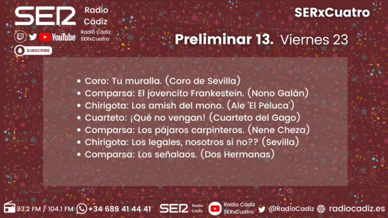 La decimotercera preliminar abre la previa del fin de semana. El último de esta fase y que pone sobre las tablas del Gran Teatro Falla nada más y nada menos que dos primeros premios. En la modalidad de chirigota defenderá lo ganado la chirigota de Ale 'El Peluca', quien se llevó al bolsillo liderar el pasado COAC en el año que era autor en solitario. Por otro lado, en la modalidad de cuartetos, llega el del Gago, en busca de sumar un nuevo primero.