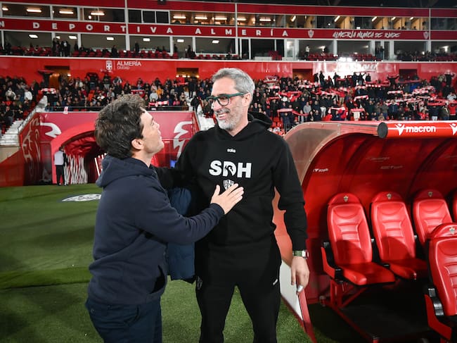 Bolo saluda Rubi en el Almería-Huesca del Estadio de los Juegos Mediterráneos. / JUAN SÁNCHEZ