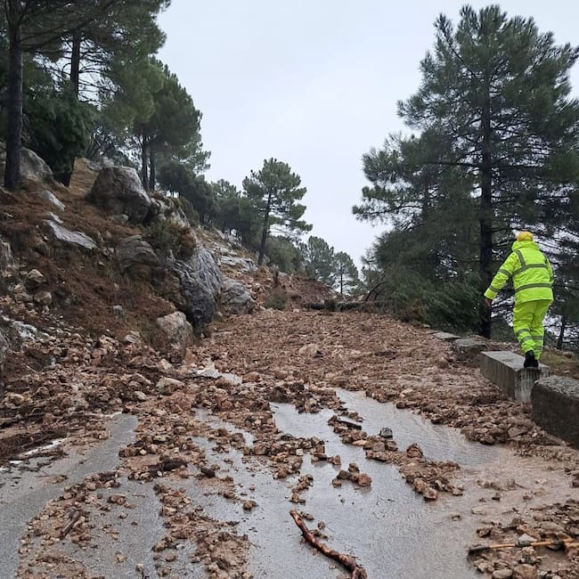 Por su parte, en la Sierra de Cádiz se ven afectadas las CA-6105 de Alberite, en Villamartín, del pk 0 al 15; la CA-9118 de acceso a Setenil; laa CA-9104 (Grazalema-Zahara de la Sierra por Las Palomas), por deslizamiento de tierras; la CA-9108 de Romaila, en Torre Alháquime, por rotura de muro de sostenimiento de la calzada; la CA-9101 (Olvera-Coripe), entre los puntos 0 y 8; y la CA-9120 (Setenil-Torre Alháquime), entre los puntos 7 y 8.