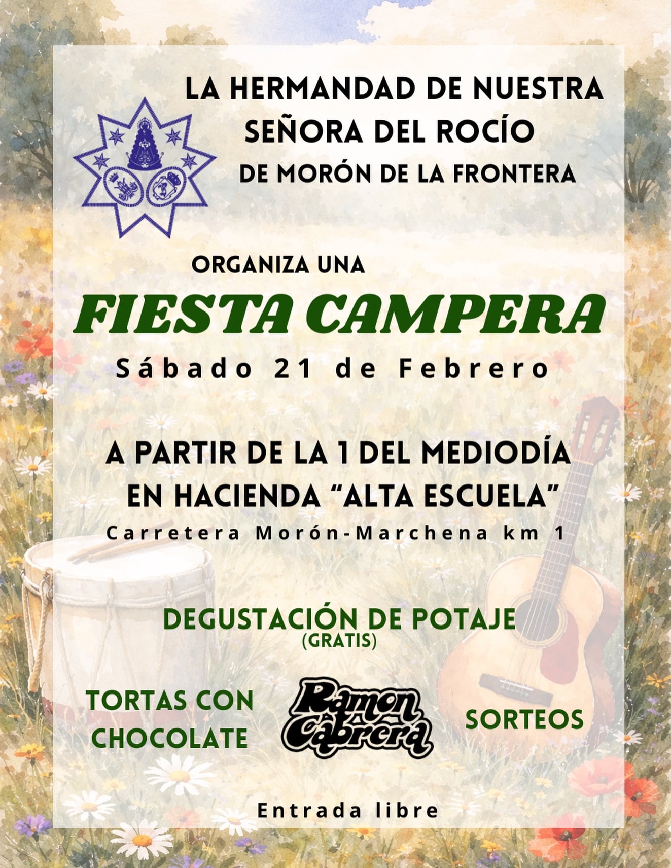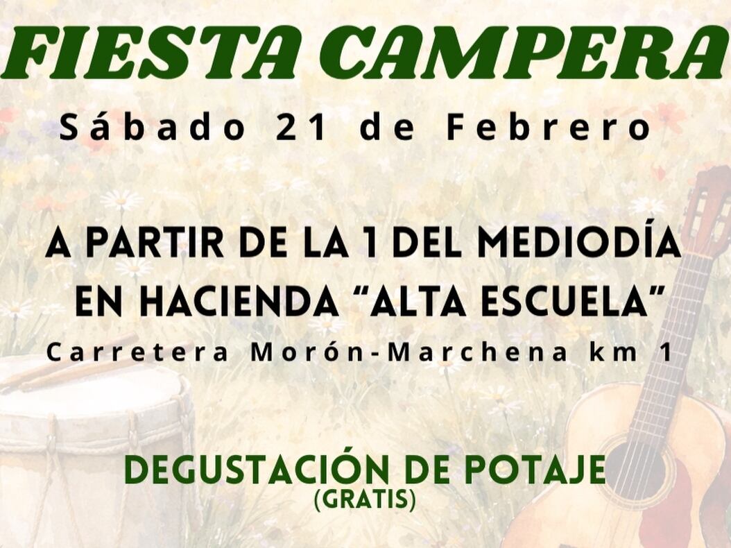 La Hermandad del Rocío de Morón ha anunciado la celebración de una Fiesta Campera el próximo sábado 21 de febrero a partir de las 13:00 horas, en la Hacienda Alta Escuela, situada en la carretera Morón–Marchena, kilómetro 1.