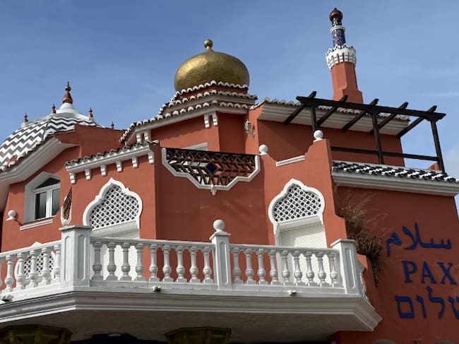 La Casa de la Paz está coronada por una doble cúpula de hierro y cristal. En su fachada tiene escrita en grandes letras la palabra Paz en tres idiomas diferentes: latín, árabe y hebreo y en su interior acoge suelos de cerámica, mosaicos y piezas de arte, que el propietario ha ido recopilando a lo largo de los años gracias a sus viajes por del mundo / Casa de la Paz