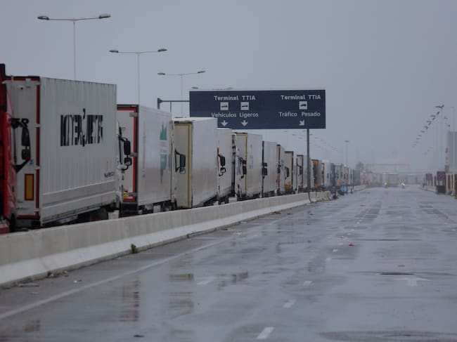 ALGECIRAS (ESPAÑA), 27/01/2026.- Se acumulan camiones aparcados en el puerto de Algeciras desde que se cancelaran todas las comunicaciones marítimas en el Estrecho de Gibraltar a consecuencia de la borrasca Joseph. EFE/A.Carrasco Ragel. / A.Carrasco Ragel (EFE)