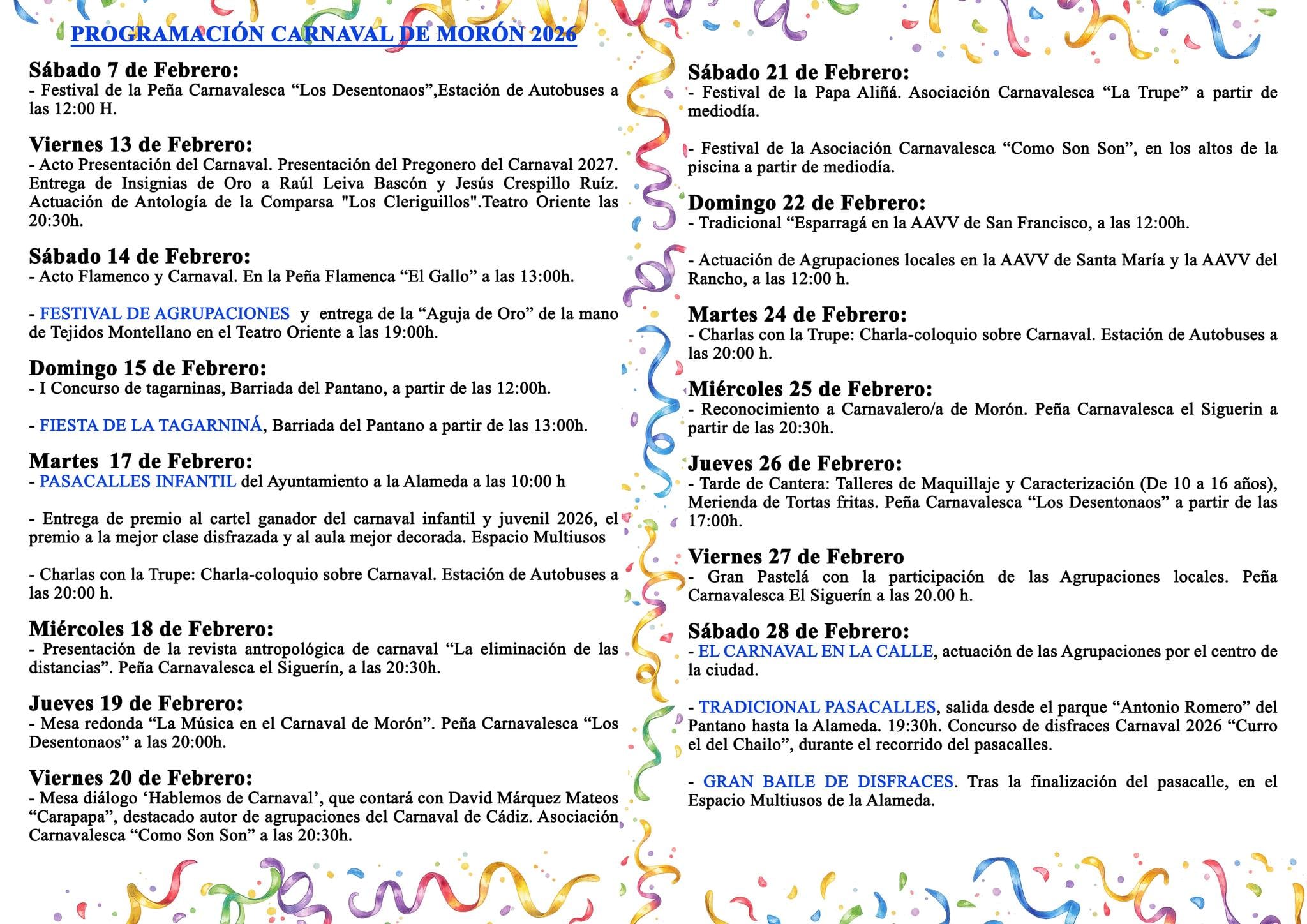 El resto de actividades, entre las que se incluyen festivales organizados por las peñas carnavalescas y actos en asociaciones de vecinos, podrán consultarse en el programa de mano.