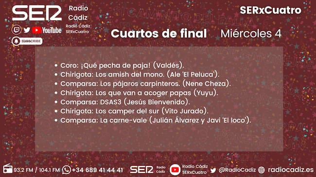 El penúltimo día de estos Cuartos de Final deja una de las mejores sesiones de esta fase. En ella, la chirigota de Ale 'El Peluca' y la del Yuyu, y la comparsa 'D3SAS3', de Jesús Bienvenido. También estarán el coro de Valdés, la comparsa de Nene Cheza y la de Julián Álvarez, y la chirigota de Vito Jurado.