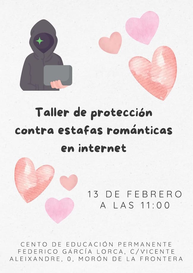 Con la proximidad del 14 de febrero, Día de San Valentín, el Centro Municipal de Información a la Mujer ha decidido poner el foco en una problemática cada vez más extendida: las estafas románticas en Internet. El próximo viernes 13 de febrero a las 11:00 horas se celebrará un taller informativo en el Centro de Adultos Federico García Lorca, dirigido a toda la población adulta, hombres y mujeres.