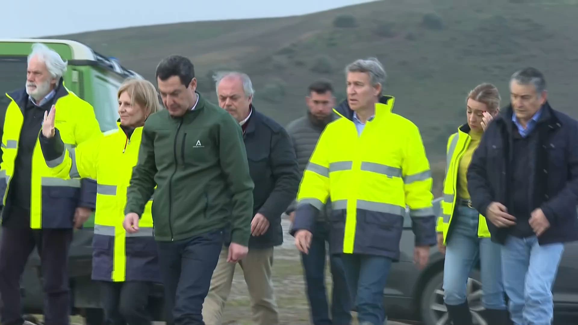 JEREZ DE LA FRONTERA (CÁDIZ), 12/02/2026.- El presidente del Partido Popular, Alberto Núñez Feijóo (2d), acompañado por el presidente de la Junta de Andalucía, Juanma Moreno (2i), el consejero andaluz de Sanidad, Presidencia y Emergencias, Antonio Sanz (i), y la alcaldesa de Jerez de la Frontera, María José García-Pelayo (3i), recorre Jerez de la Frontera mientras visita algunas de las zonas más afectadas por el temporal en Andalucía, este jueves. EFE/ Román Ríos / Román Ríos
