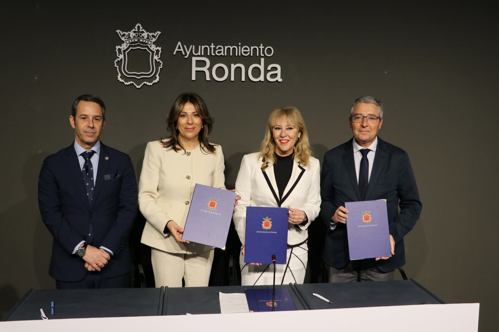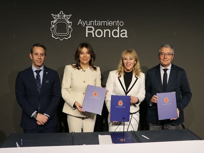 La alcaldesa de Ronda, Mari Paz Fernández, ha firmado dos convenios: uno con la consejera de Economía, Hacienda y Fondos Europeos de la Junta de Andalucía, Carolina España, y otro con el presidente de la Diputación Provincial de Málaga, Francisco Salado. En el acto también ha estado presente el vicerrector de la UMA, Francisco Vila.