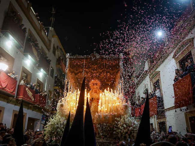 La Virgen Esperanza de Triana de la Hermandad Sacramental del Stmo. Cristo de la Tres Caídas y Nuestra Señora de la Esperanza cruza el Puente de Triana tras su salida de la Capilla de los Marineros para su estación de penitencia en la Madrugá esta noche en Sevilla. EFE/José Manuel Vidal / Jose Manuel Vidal (EFE)