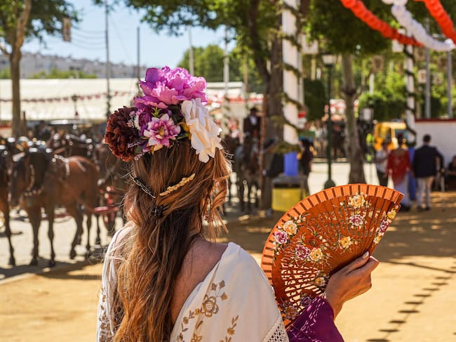 Archivo - Una mujer vestida de flamenca se abanica en el recinto ferial de la Feria de Abril de Sevilla, en foto de archivo. - Eduardo Briones - Europa Press - Archivo