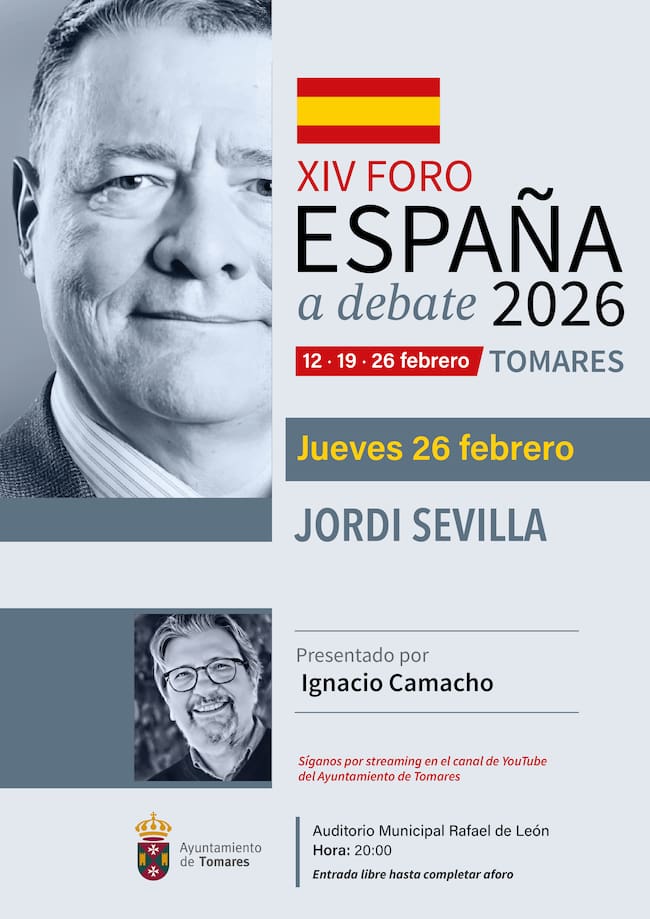 El Ayuntamiento de Tomares cerrará este jueves, 26 de febrero, el XIV Foro España a Debate “Ciudad de Tomares” 2026, con Jordi Sevilla, ex Ministro de Administraciones Públicas entre 2004 y 2007, quién será introducido por el periodista y columnista Ignacio Camacho. Será a las 20:00 horas en el Auditorio Municipal Rafael de León. Entrada libre hasta completar aforo. También podrá seguirse por streaming a través del canal de YouTube del Ayuntamiento de Tomares.