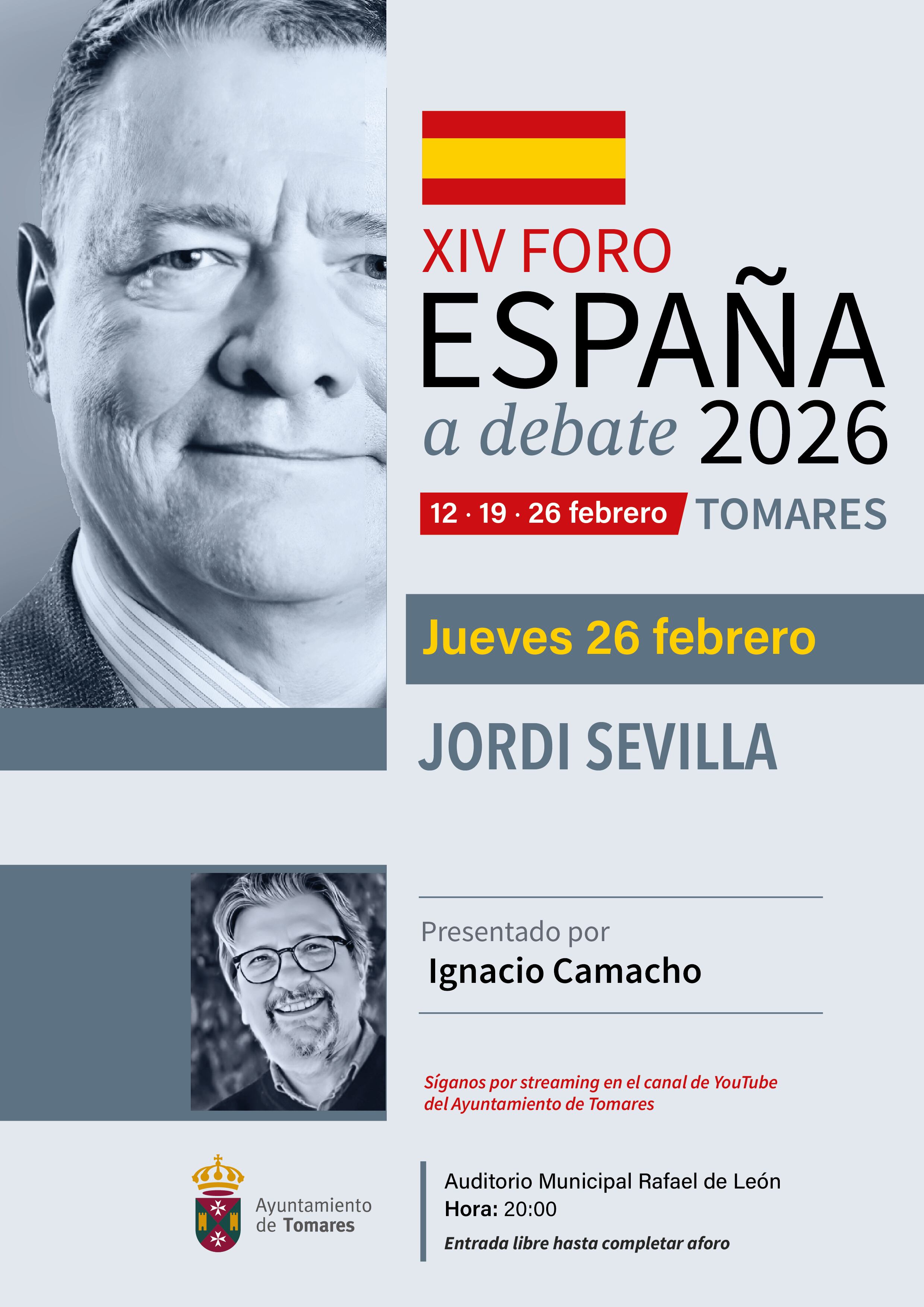 El Ayuntamiento de Tomares cerrará este jueves, 26 de febrero, el XIV Foro España a Debate “Ciudad de Tomares” 2026, con Jordi Sevilla, ex Ministro de Administraciones Públicas entre 2004 y 2007, quién será introducido por el periodista y columnista Ignacio Camacho. Será a las 20:00 horas en el Auditorio Municipal Rafael de León. Entrada libre hasta completar aforo. También podrá seguirse por streaming a través del canal de YouTube del Ayuntamiento de Tomares.