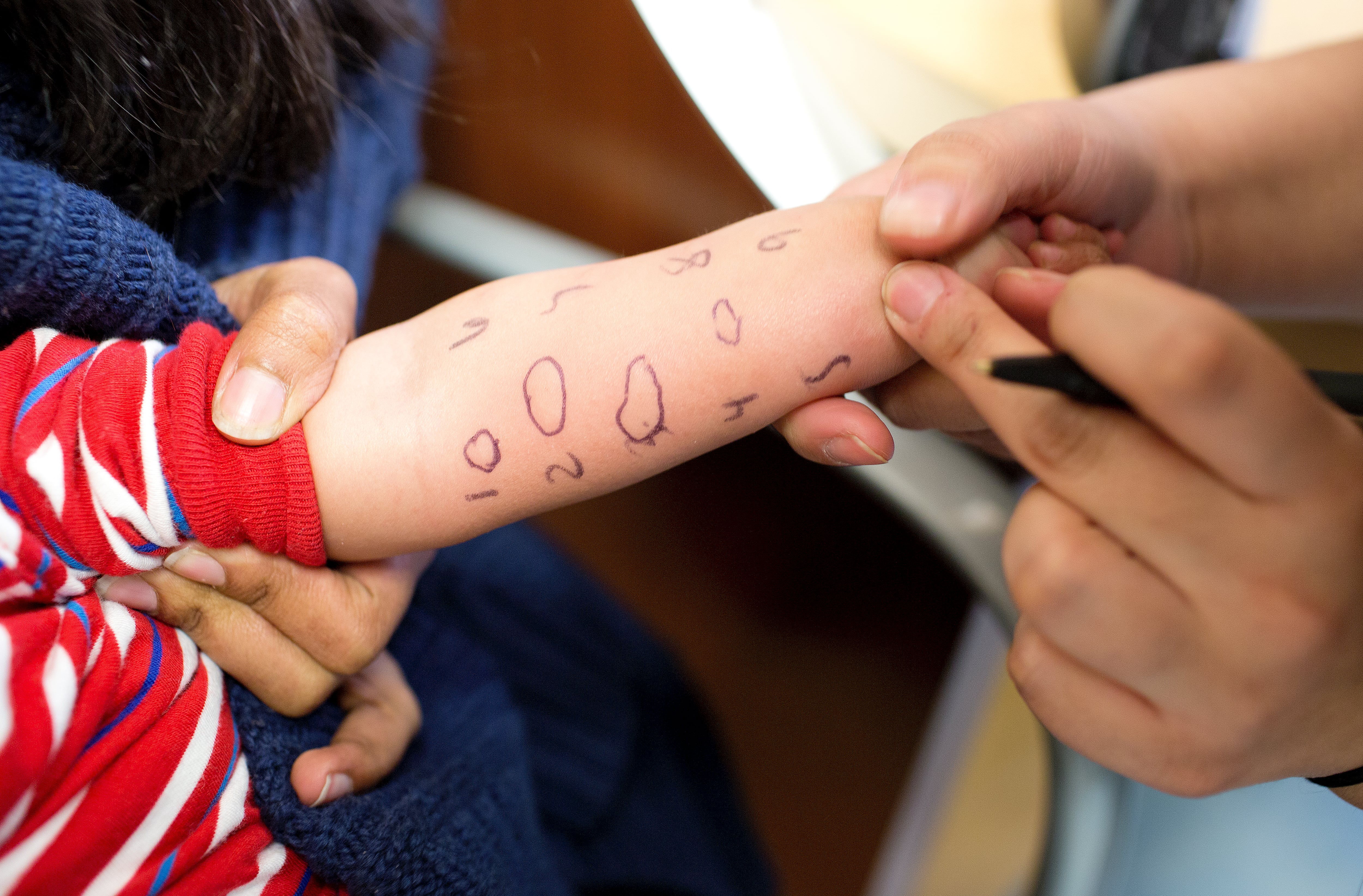 NEW YORK, NY - SEPTEMBER 15: At an undisclosed hospital, a child is tested for allergic reactions to various substances at an allergy clinic on September 15, 2016 in New York City. (Photo by Andrew Lichtenstein/Corbis via Getty Images) / Andrew Lichtenstein